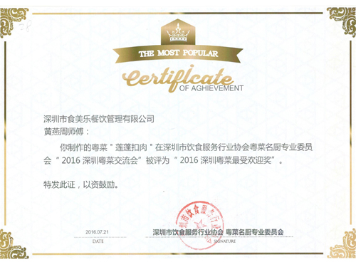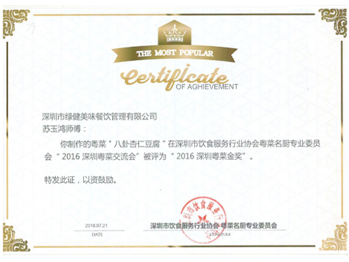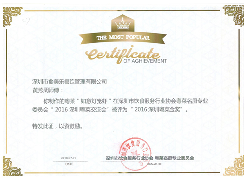 我司研發(fā)部丁總帶隊(duì),攜大廚蘇玉洪、黃燕周參加了由深圳市飲食服務(wù)行業(yè)協(xié)會(huì)粵菜名廚專業(yè)委員會(huì)舉辦的“2016深圳粵菜交流會(huì)”。我司大廚蘇玉洪制作的"八卦杏仁豆腐"、黃燕周制作的“如意蝦燈”及“蓮蓬扣肉”被評(píng)為2016年深圳粵菜金獎(jiǎng)。